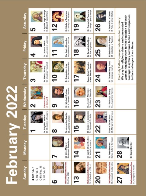 Sunday NM Feb. 1 FQ Feb. 8 FM Feb. 16 LQ Feb. 23 5th Sunday in Ordinary Time 6th Sunday in Ordinary Time St. Catherine of Ricci 7th Sunday in Ordinary Time Sts. Francisco & Jacinta, Fatima 8th Sunday in Ordinary Time St. Gregoro of Narek