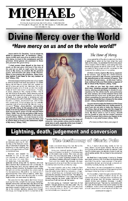 This 8-page leaflet contains explanations on the message of Jesus to Saint Faustina Kowalska of Poland on Divine Mercy, the testimony of Gloria Polo of Colombia of what she saw after she was declared clinically dead, explanations on the sacrament of penance or confession, and one page on the life of "Little Audrey" Marie Santo of Massachusetts.
